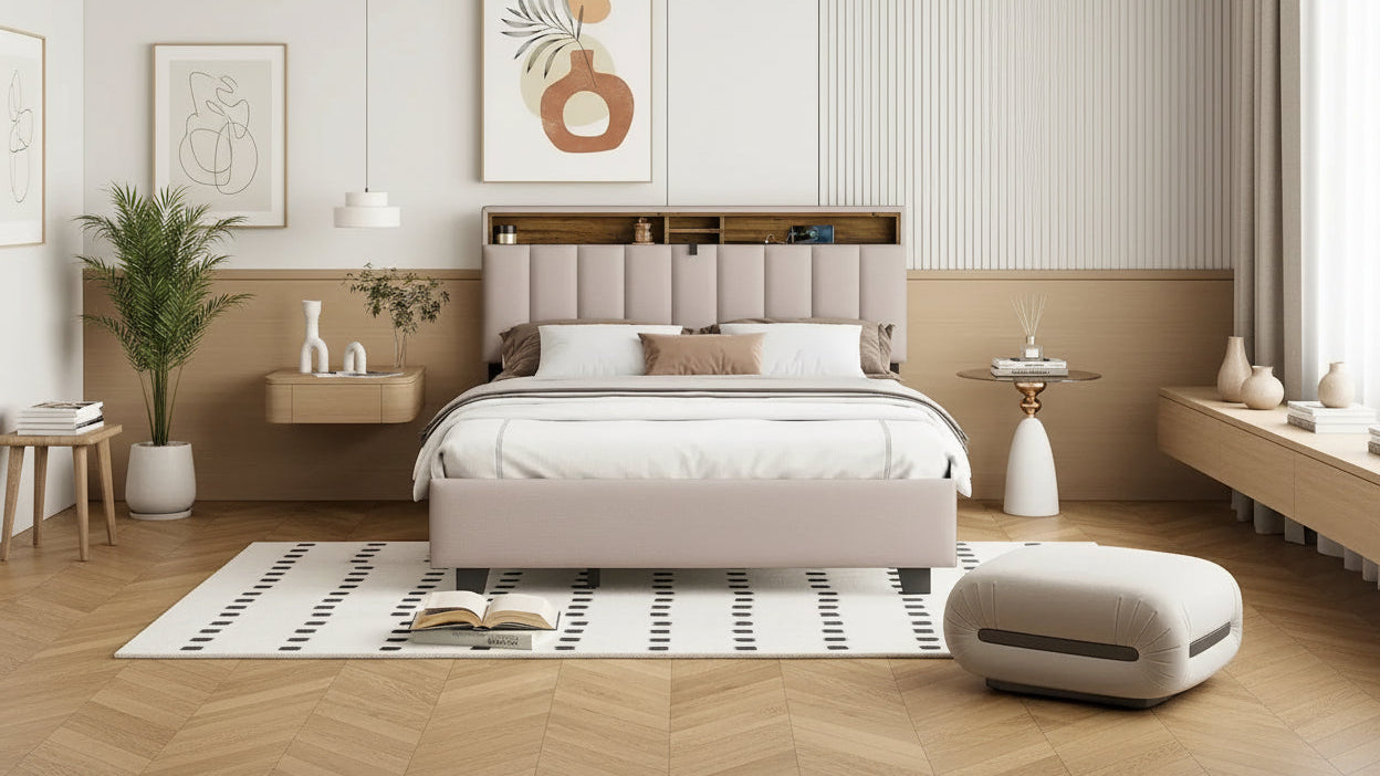 Lit plateforme Queen avec lit gigogne, tiroirs et ports USB, en lin, robuste et spacieux